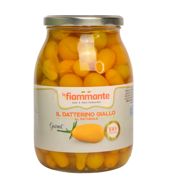 Il Datterino Giallo Fiammante, intero e al naturale, è un concentrato di dolcezza e freschezza. Ideale per piatti raffinati, donando un tocco di colore e un sapore delicato a sughi, pesce e pizze gourmet. Una scelta perfetta per chi cerca qualità e autenticità in cucina.