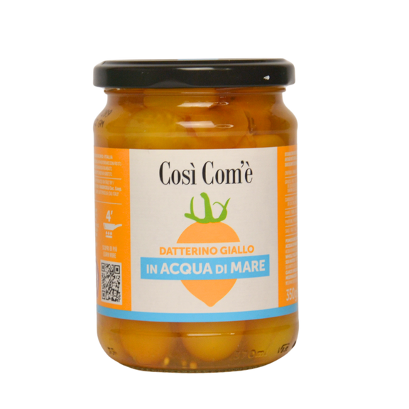 Il Datterino Giallo intero Fiammante, immerso in acqua di mare, offre un'esperienza unica dal sapore autentico e intenso. La naturale dolcezza del pomodoro si sposa con le note salmastre, ideale per esaltare piatti di pesce, primi gourmet e ricette innovative.