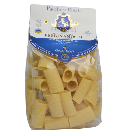 I Paccheri rigati di Gragnano sono una delle eccellenze italiane che riempie di gusto e qualità i primi piatti della cucina mediterranea. È ottenuta a partire da un impasto di grano di semola di grano duro ed acqua delle fonti di Gragnano. La sua speciale trafilatura al bronzo conferisce un gusto intenso e valorizza i condimenti scelti, assorbendone ed esaltandone il sapore.